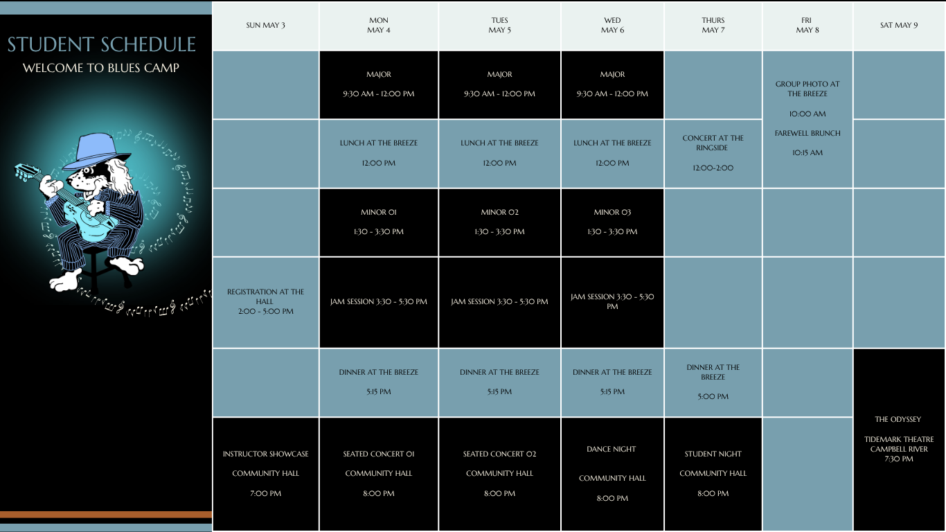 Wednesday Afternoon. The week wraps with applied learning, performance, ensemble skills, and jam-ready tools.